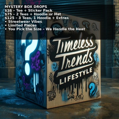 Built for the ones who stay fresh without trying too hard, the $75 Essentials Box delivers hand-picked apparel from our most popular designs. Expect fire T-shirts, possible headwear, and exclusive pieces not listed online. No fluff — just the realest gear from Timeless Trends.