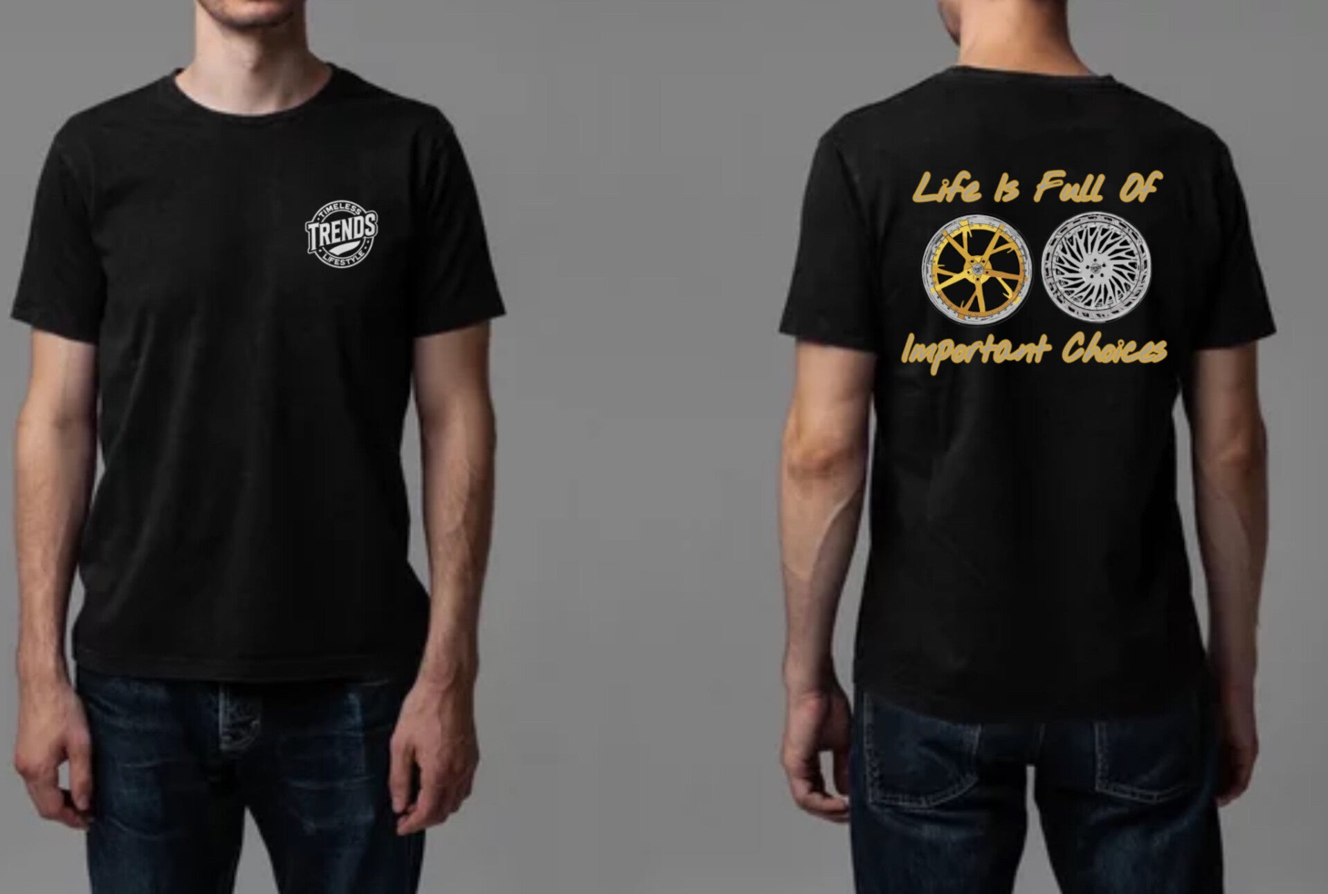 Life’s full of choices — and in this scene, wheel style says everything. The Important Choices T-Shirt features two bold rim designs in gold and silver, backed by clean text and a left-chest logo. Built for big wheel heads, show stoppers, and anyone who knows fitment matters.